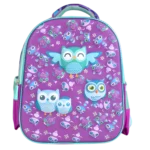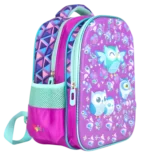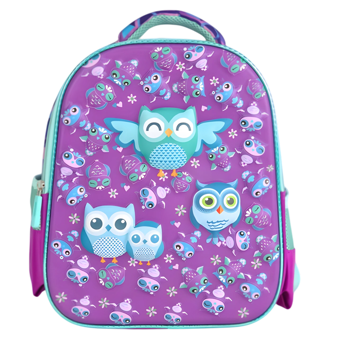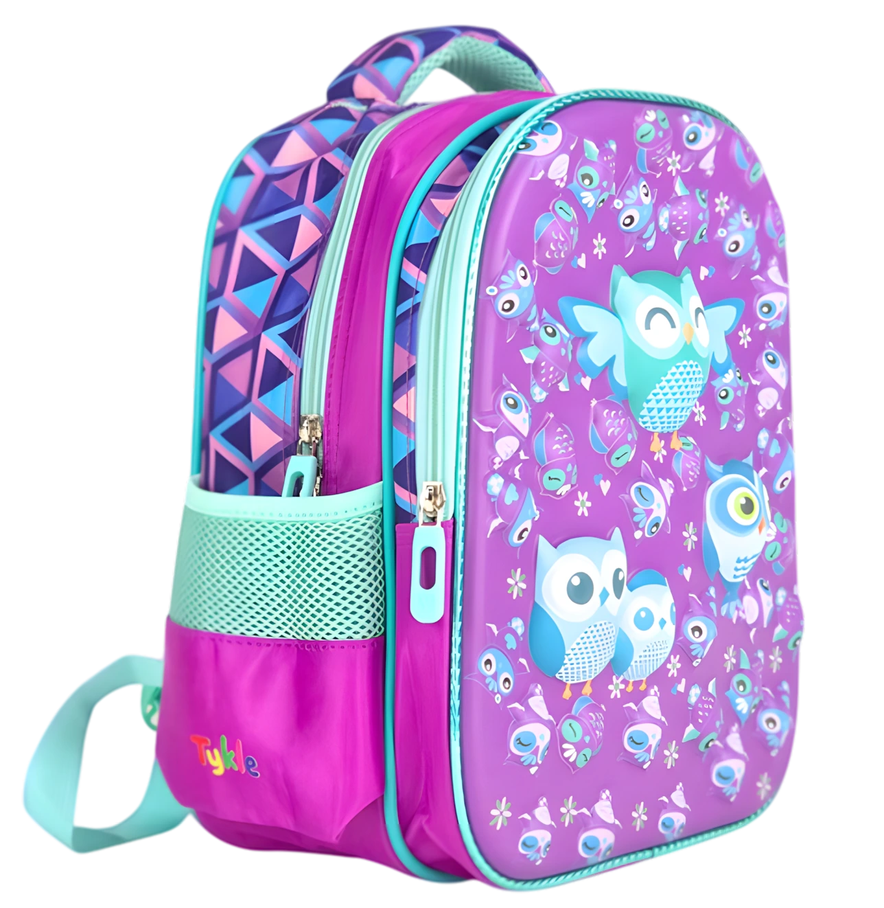 Design : Tykle Cute Owl 3D Kids Bag features prominent 3D Owls Design on the front. The backpack is predominantly purple and features a hard-shell front panel with vibrant cartoon owl graphics pattern. It has light blue/teal accents on the sides and handles.