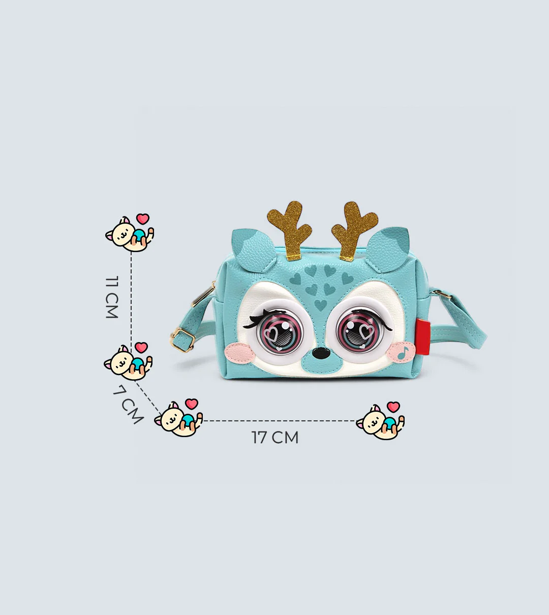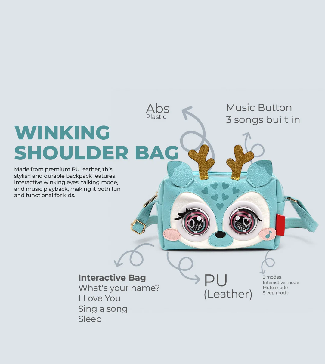 The Winking Elf Shoulder Bag – Deer by TYKLE is a playful and functional accessory for kids. Crafted from premium PU leather, this stylish deer-themed bag features interactive winking eyes, talking mode, and music playback, adding an element of fun to any outing. Perfect for carrying daily essentials, it’s lightweight, durable, and designed to entertain while being easy to clean and maintain.