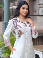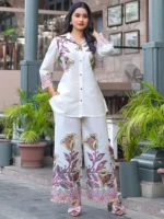 Be the first to review “Umrao Curved style mulmul fabric cream colour Co-ord Set” Cancel reply