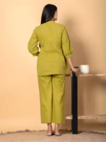 • Co-ord set has a Top and Trouser , Green,White and Pink Yoke design Top has a Mandarin Collar, three quarter sleeves and secured with slip on closure.