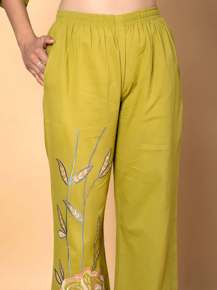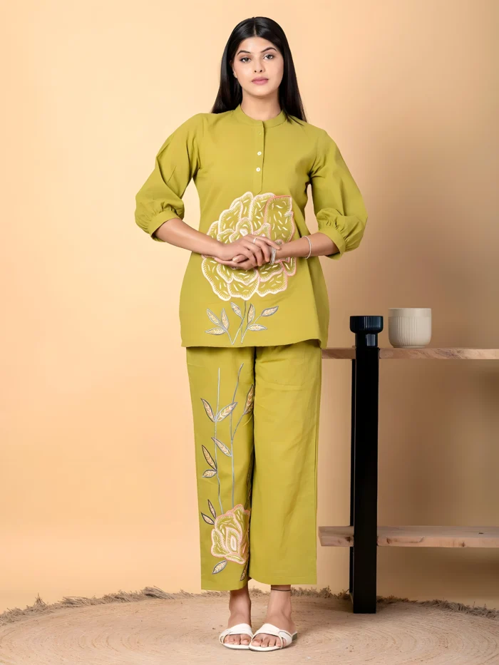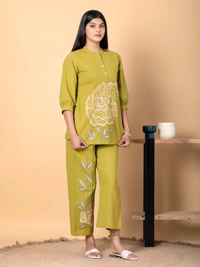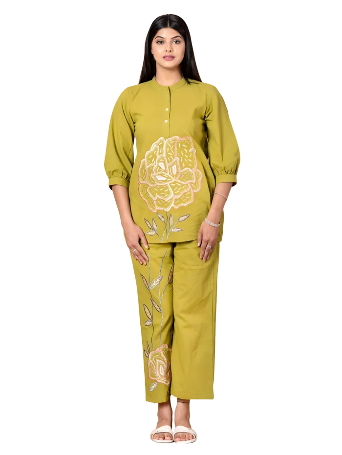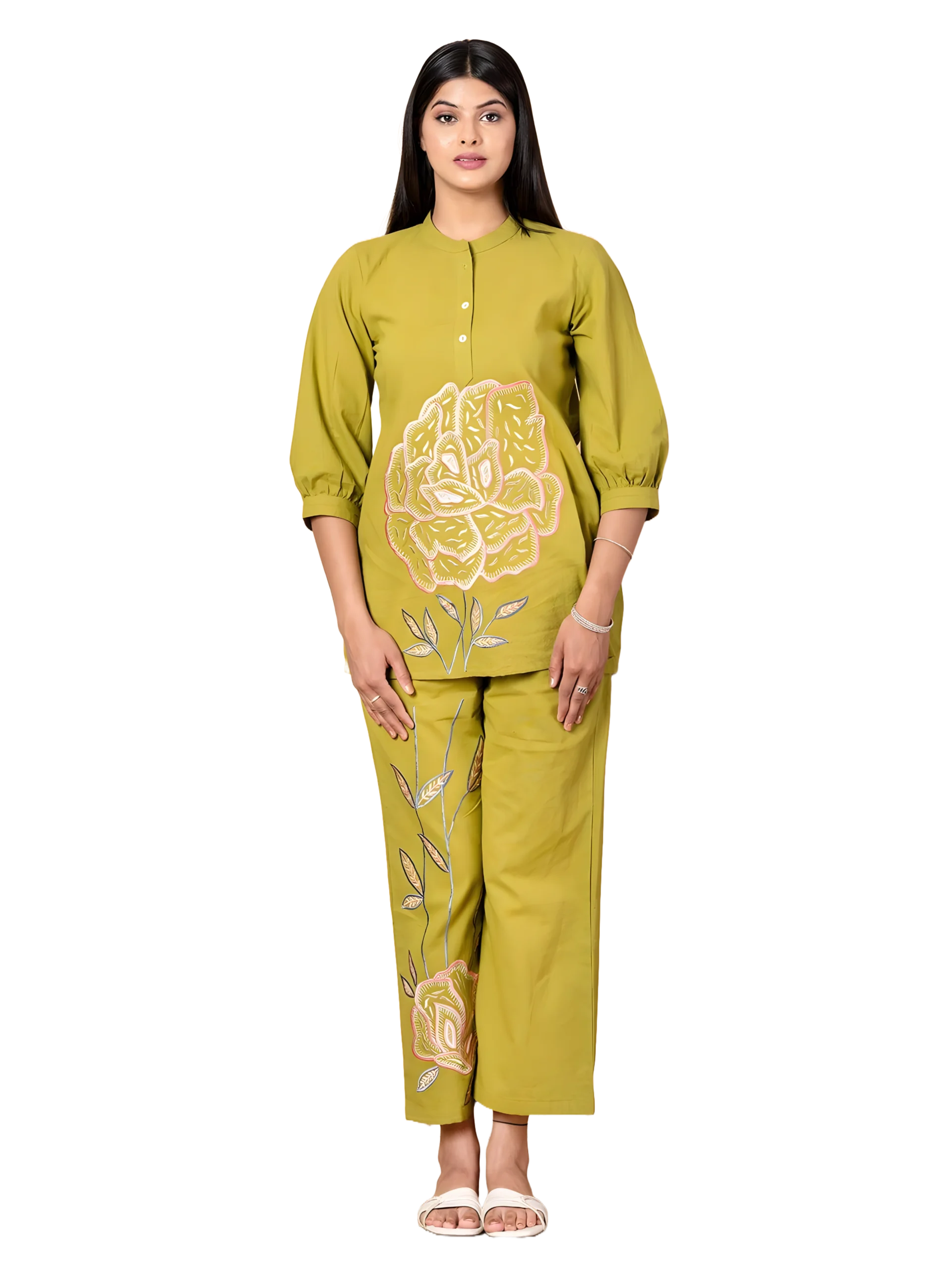 Home Women's Cord Sets Umrao FLoral Yoke Design Mandarin Collar Top with Trouser