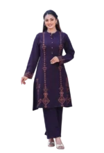 Experience Elegance with Umrao Designer co-ord set crafted from breathable woolen stuff. Designed with intricate threadwork and a flattering Silhouette , this piece blends comfort with timeless grace.
