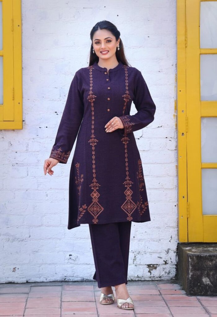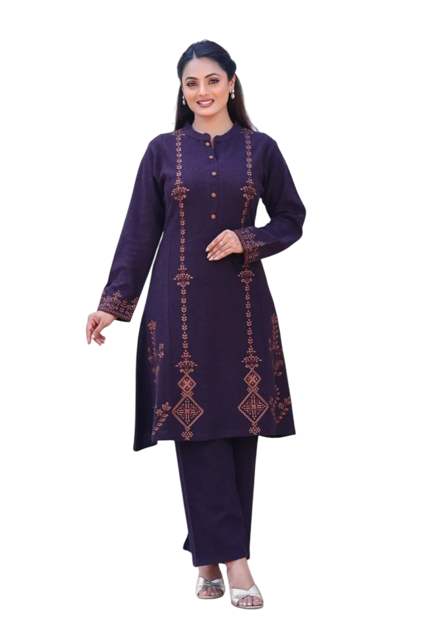Experience Elegance with Umrao Designer co-ord set crafted from breathable woolen stuff. Designed with intricate threadwork and a flattering Silhouette , this piece blends comfort with timeless grace.
