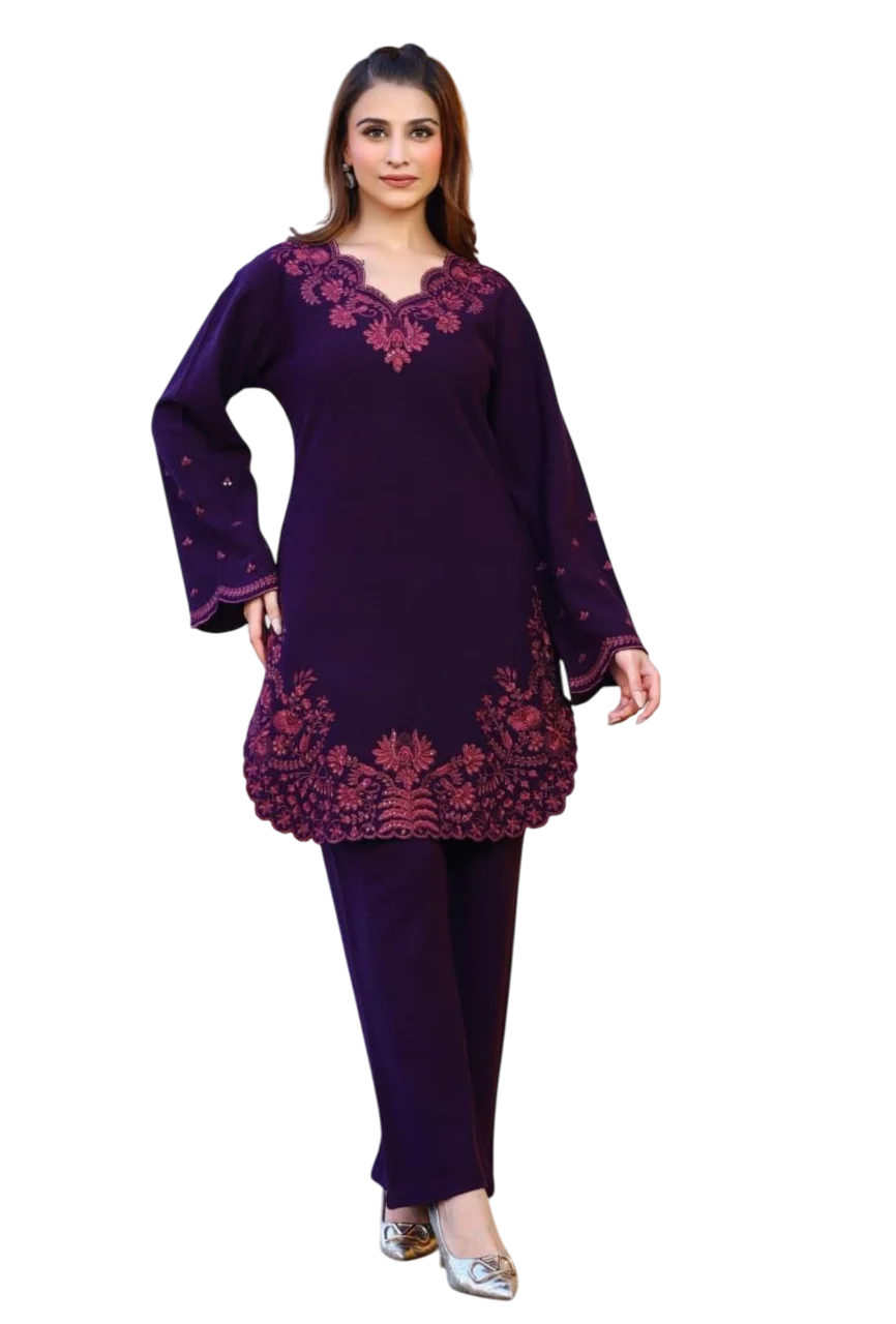 Experience Elegance with Umrao Designer co-ord set crafted from breathable woolen stuff. Designed with intricate threadwork and a flattering Silhouette , this piece blends comfort with timeless grace.